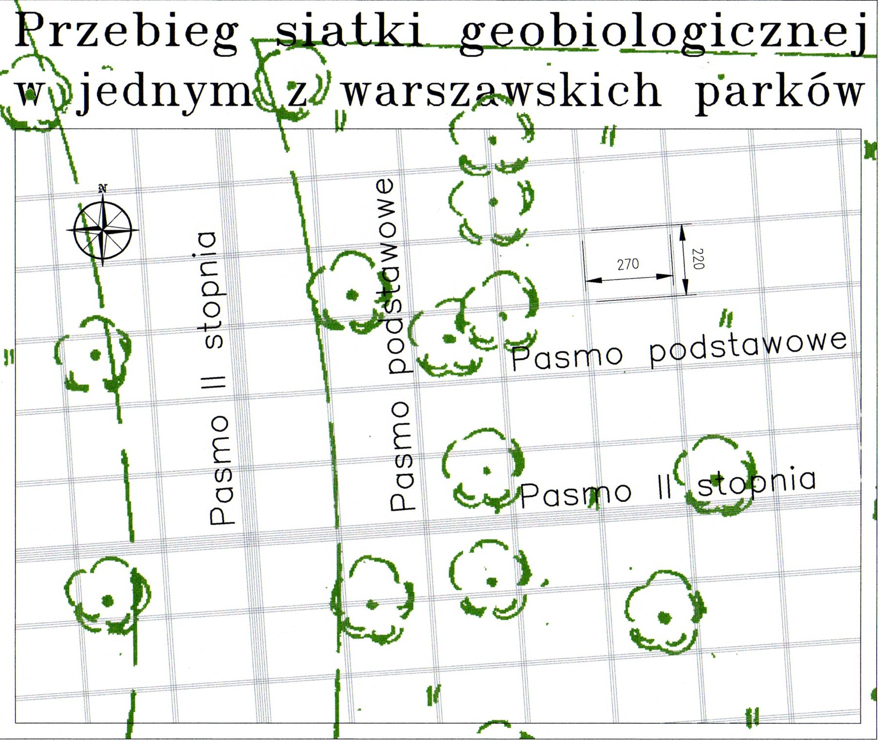 Przebieg siatki geobiologicznej (Hartmana) w jednym z warszawskich parków